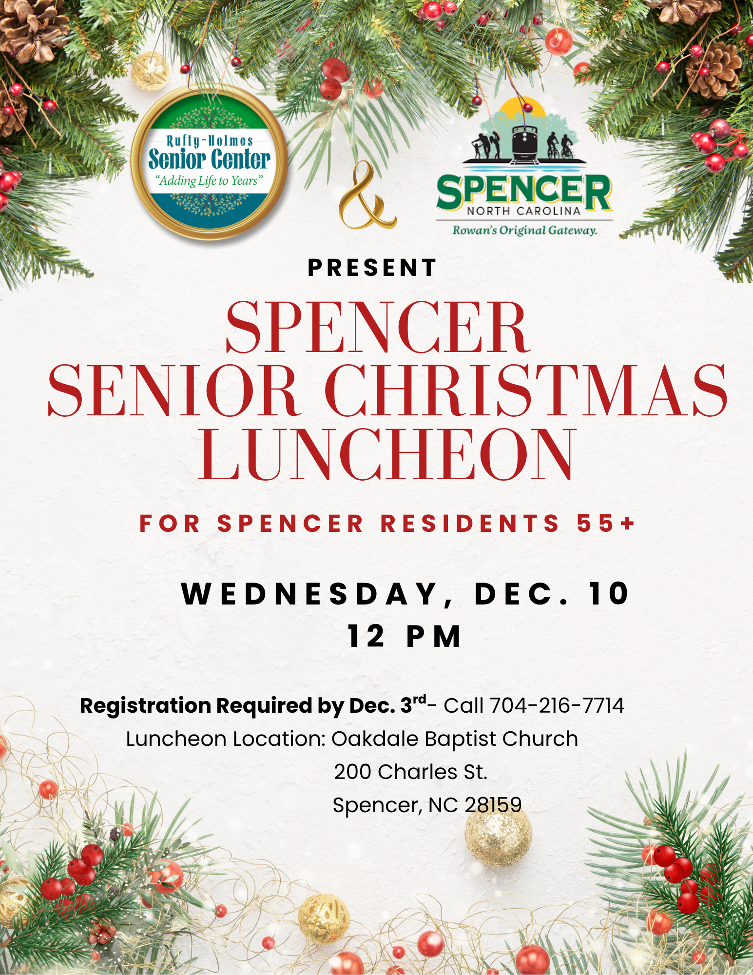 The Spencer Senior Christmas Luncheon hosted by the Rufty-Holmes Senior Center and the Town of Spencer will be held on Wednesday, December 10, 2025, at 12:00 p.m. at the Oakdale Baptist Church. The luncheon is open to Spencer residents who are 55+, and registration is required, but the event is free. Please call 704-216-7714 to register by Tuesday, December 3. We look forward to seeing you there!