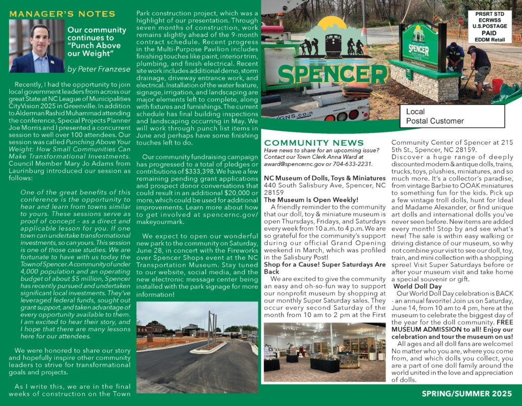 Click the image below for the PDF of the Spring/Summer 2025 Newsletter for the Town of Spencer, NC.